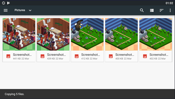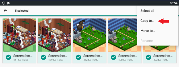 Now that you're in the file manager, browse to the folder where the files you want to copy are located. I wanted to copy some screenshots so I went into Pictures. Once you've found your files, click and hold to select each file then press the 3 dots and "Copy to..." like below. You can also click "Move to..." to just move the files.