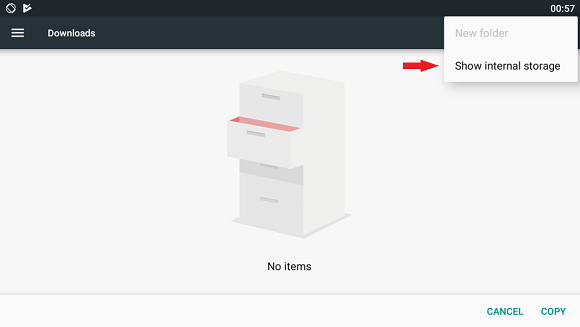 Once you've done this part you'll be sent to a grey screen with a left menu open that should say "Recent" and "Downloads", but you won't be able to progress just yet because the link to the internal storage is hidden by default. Click the 3 dots in the upper right corner to open a little menu and click "Show internal storage" like below.