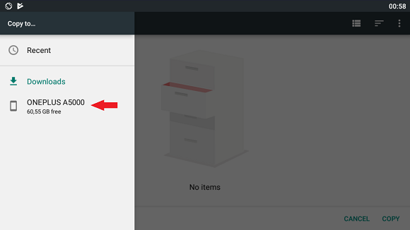 Now open the menu on the left again and you should see a new link with a phone icon, possibly with the name ONEPLUS A5000. Clicking it will let you access the internal storage again to let you move your files.