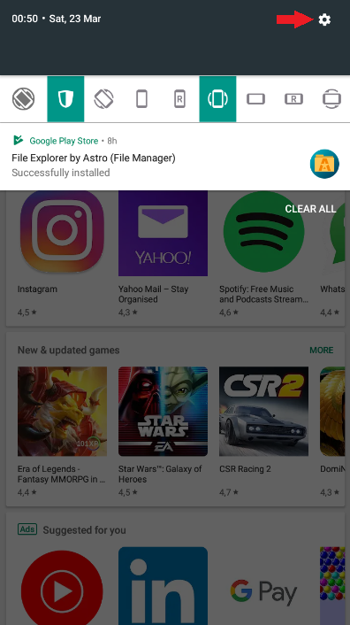 In order to gain access to the file manager, you need to get to the Android settings menu. There's no link within the Bluestacks GUI to access it anymore, so the way you go about it is to open any app you have installed, drop down the top bar by swiping downwards at the top of the Bluestacks screen while in the app, then click the gear icon within. Should look like this: